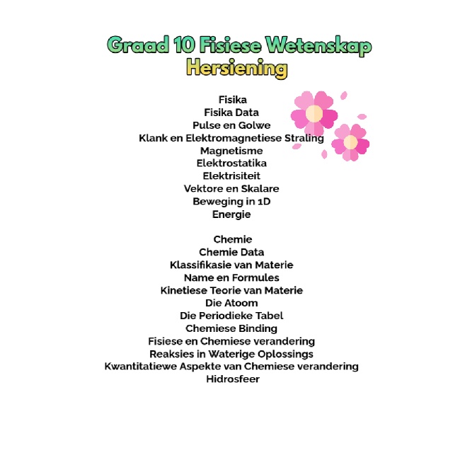 Hierdie dokument dek Graad 10 Fisiese Wetenskap vraestel 1 en 2 en dek die volgende konsepte en bevat vrae en antwoorde daaroor:Fisika Data ,Pulse en Golwe ,Klank en Elektromagnetiese Straling ,Magnetisme ,Elektrostatika ,Elektrisiteit ,Vektore en Skalare ,Beweging in 1D ,Energie ,Chemie Data,Klassifikasie van Materie,Name en Formules,Kinetiese Teorie van Materie,Die Atoom,Die Periodieke Tabel,Chemiese Binding,Fisiese en Chemiese verandering,Reaksies in Waterige Oplossings ,Kwantitatiewe Aspekte van Chemiese verandering en Hidrosfeer