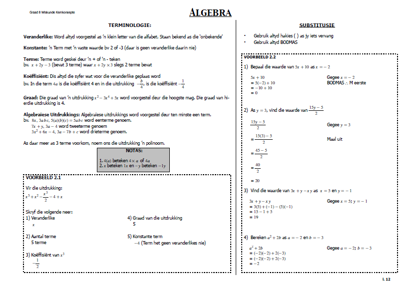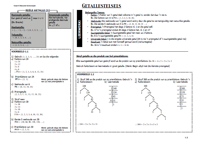 Hierdie dokument dek Graad 8 wiskunde vraestel 1 en 2 en dek die volgende konsepte en bevat vrae en antwoorde daaroor: Getallestelses ,Heelgetalle ,Rasionale Getalle ,Algebra ,Eksponente ,Vergelykings ,Finansies,Verhouding en Koers ,Getal Patrone ,Grafiek Interpretasies  ,Euklidiese Meetkunde: Lyne en Hoeke ,Euklidiese Meetkunde: Driehoeke ,Vierhoeke ,Transformasies ,Meting ,Statistiek  en Waarskynlikheid.