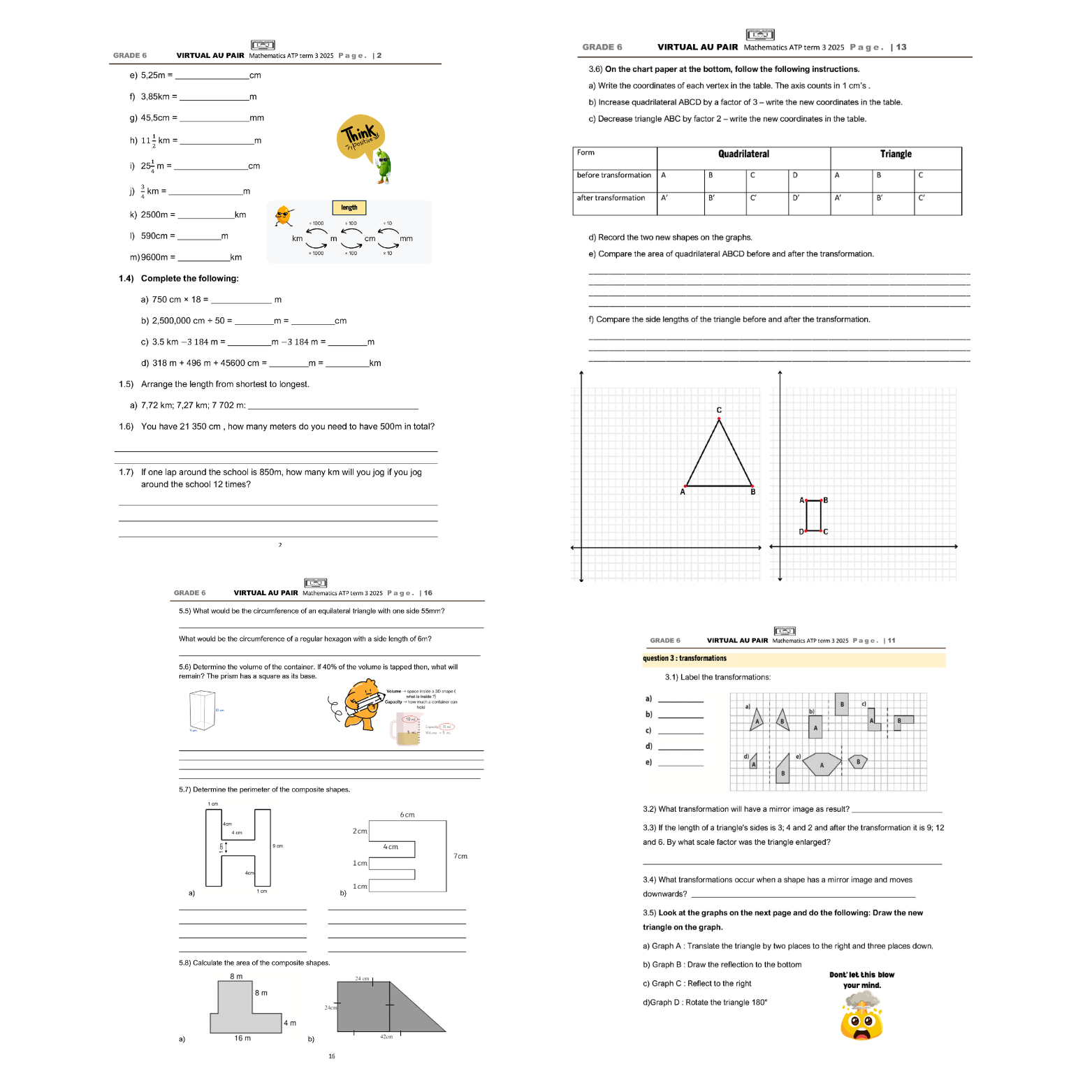 Grade 6 Maths term 3 ATP : shapes, symmetry, transformations, area, perimeter, volume PDF booklet with an answer sheet. Very well put together assessment prep booklet – also made fun to keep the learner engaged – no more boring Math worksheets. Combination of simple as well as exam style questions.