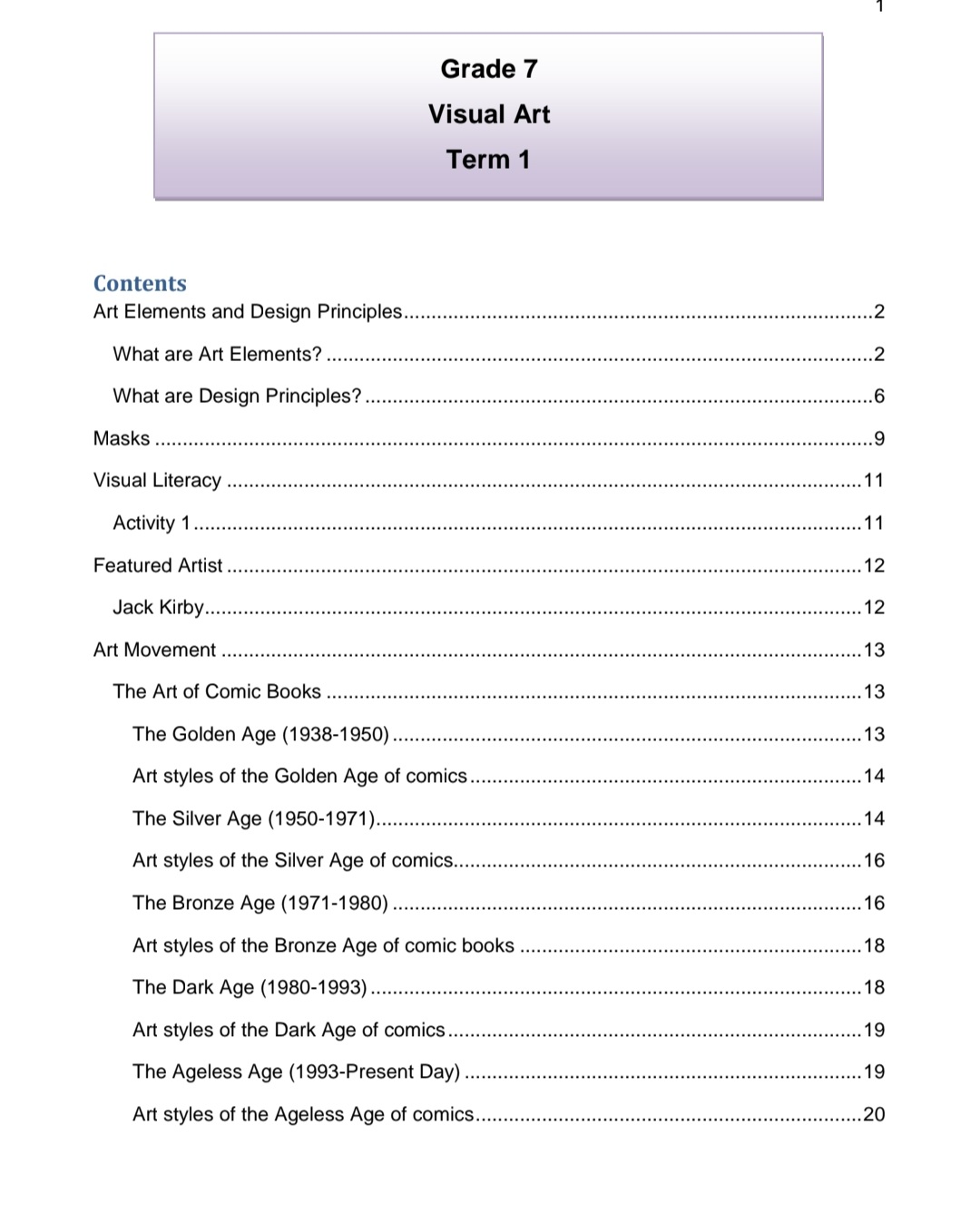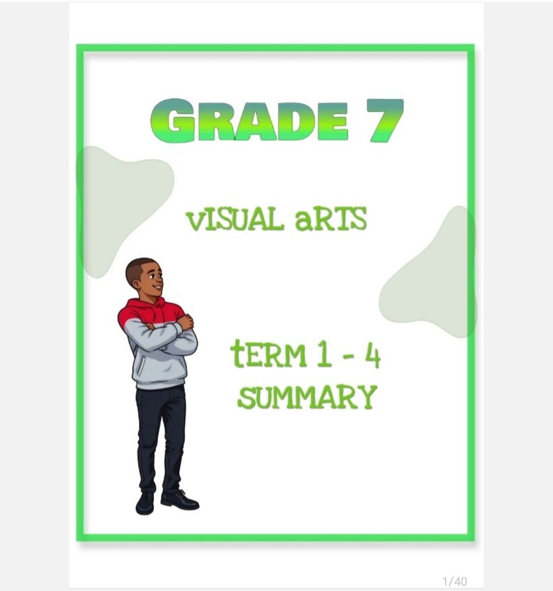 This document is a summary of Grade 7 Visual arts from Term 1 to 4 and this will help you understand it better and it has activities in between , the activities however do not have answers provided. Please leave a review and check the content pages to know what is covered in the summary.