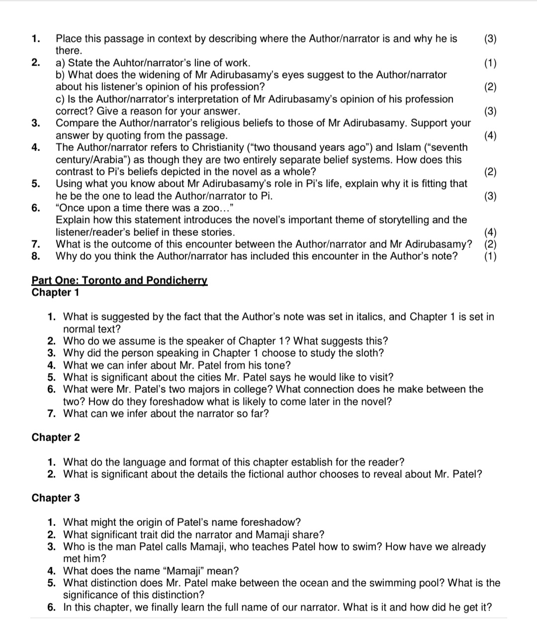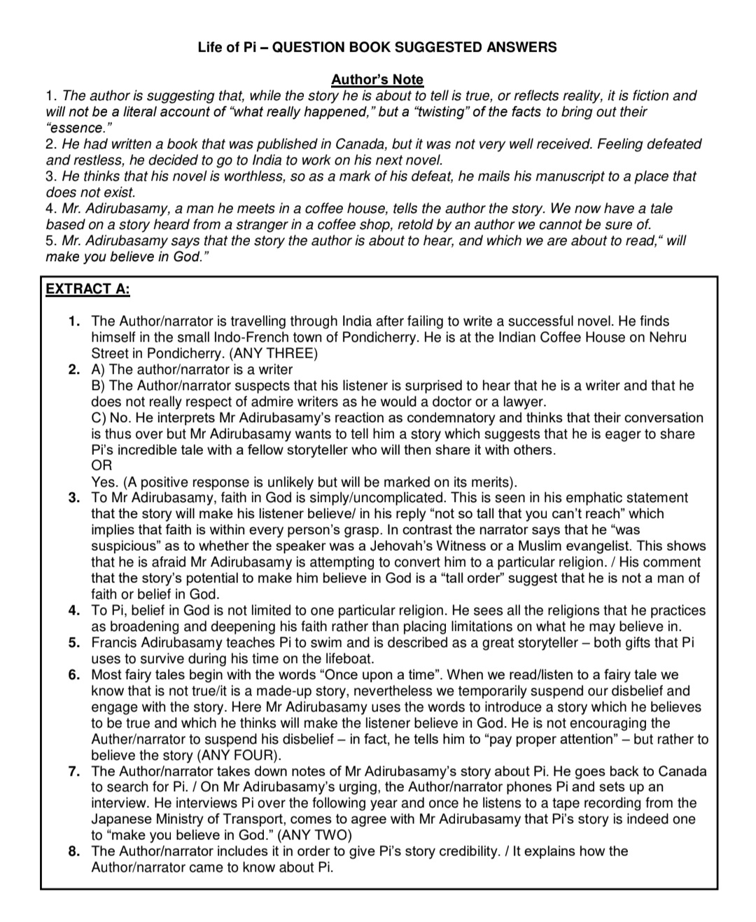 This is a Life of Pi Essay and Contextual questions with answers . They are there to help prepare your learner or child for their exams . It consists of questions with answers covering all the aspects with questions on each of the 100 chapters and essay questions as well.